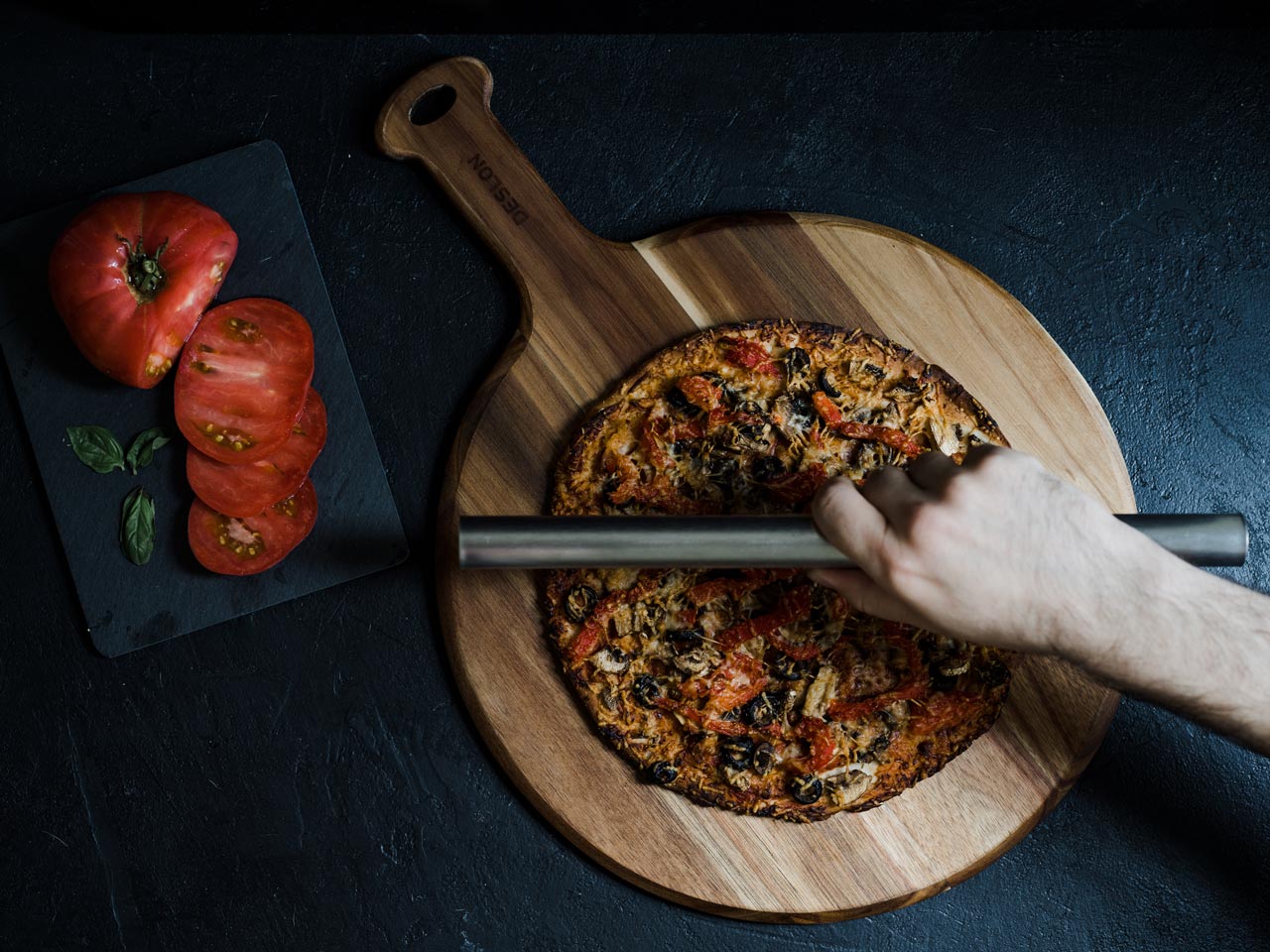 Extra-virgin olive oil, garlic, mozzarella cheese, onions, mushrooms, green olives, black olives, fresh tomatoes.